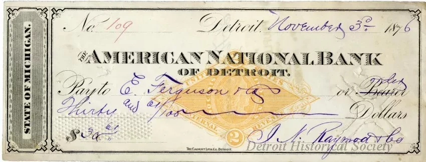 American National Bank of Detroit check, printed by the Calvert Lithographing Company, from J.N. Raymond and Company for $30.61 to E. Ferguson and Company, dated November 3, 1876. "State of Michigan," is printed along the left edge of the check. A 2 cent United States Internal Revenue Service stamp is printed in the center of the check. An "X" has been punched in the check. The verso is signed "E. Ferguson & Co.," and has been stamped by the People's Savings Bank.