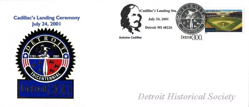 One postmarked commemorative envelope that was issued in honor of "Cadillac's Landing Ceremony, July 24, 2001," as part of the Detroit Tricentennial. The business letter size white envelope is printed with blue and black text and includes a 34¢ Tiger Stadium stamp, a special "Detroit 300" postmark, and a multi-color adhesive logo.