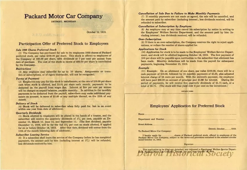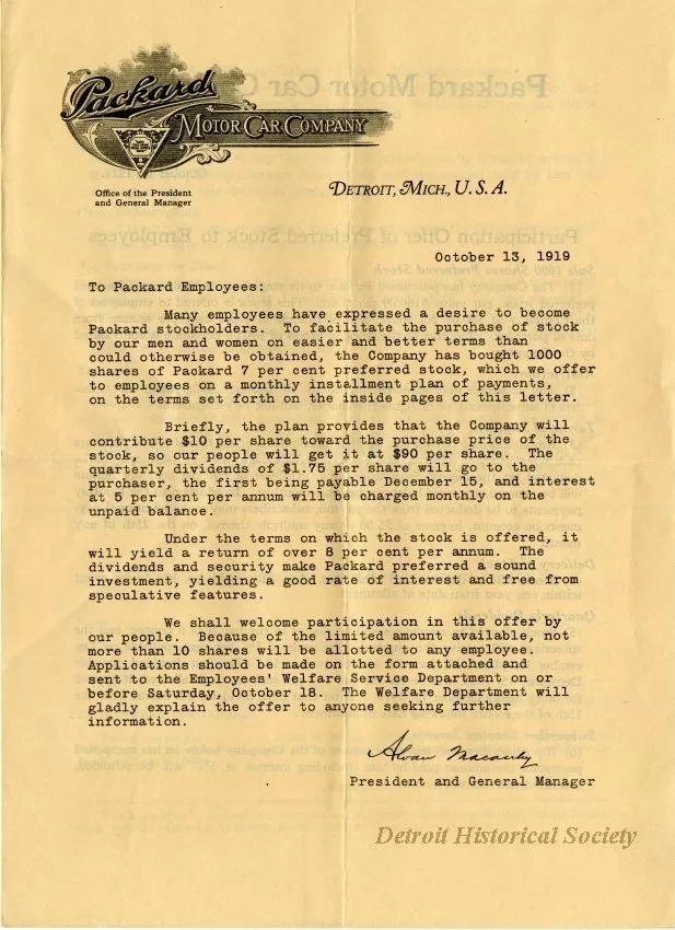 Correspondence, printed in black ink on paper, from Alvan Macauley, President and General Manager of Packard Motor Car Company to all Packard employees regarding an employee stock purchasing program. Dated October 13, 1919. The front page shows Macauley's message to employees and the inside pages detail the "Participation Offer of Preferred Stock to Employees" and include an "Employee's Application for Preferred Stock."