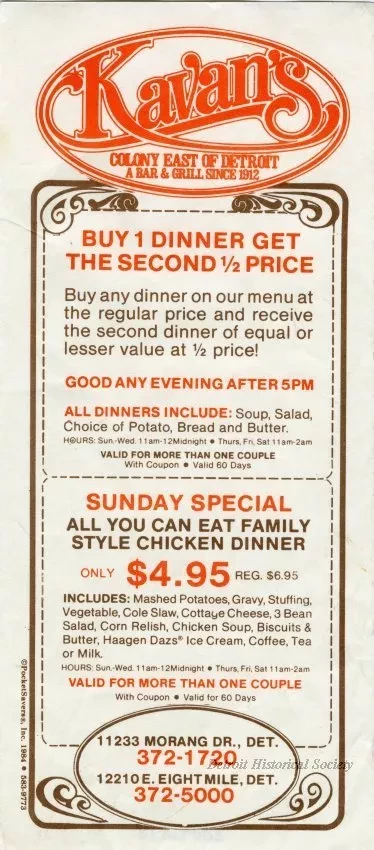 Flier with two coupons for Kavan's Colony East, with locations at 11233 Morang Drive, and 12210 East Eight Mile Road. One coupon offers a half price dinner with the purchase of one at full price. The other is for a discounted "all you can eat family style chicken dinner." The flier is printed in orange and brown.