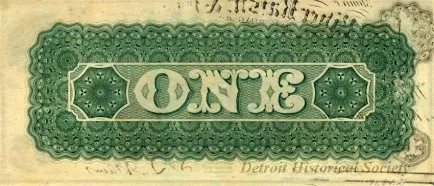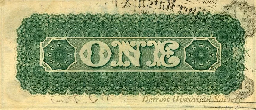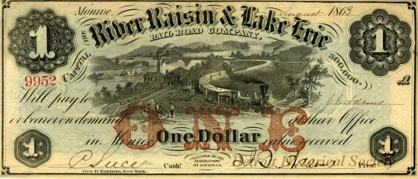 One Dollar issued by River Raisin and Lake Erie Railroad Company, dated August 1863, and signed by the company's president James Q. Adams and the cashier George D. Baldwin. An engraving of a train rounding a bend, passing a small riverside factory with a railroad bridge over the river in the background. The verso has an engraving consisting of the word, "One," is large letters surrounded by a green pattern.