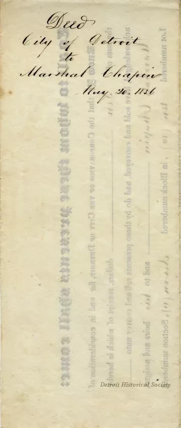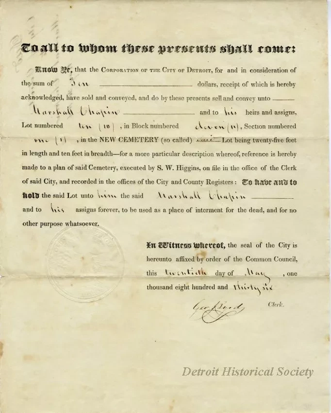 Deed for a plot in the "New Cemetery" [Russell Street Cemetery] issued by the City of Detroit to Marshall Chapin for $10. Dated May 20, 1836. Signed by George Byrd, city clerk.