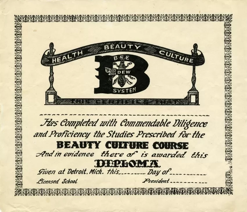 Diploma for the Bee Dew System beauty school. The diploma features a logo for the Bee Dew System at top, with a banner reading "Health Beauty Culture" above. The text of the diploma reads "This Certifies That [blank line] Has Completed with Commendable Diligence and Proficiency the Studies Prescribed for the Beauty Culture Course And in evidence there of is awarded this Diploma Given at Detroit, Mich. this [blank line] Day of [blank line] Licensed School President [blank line]."
