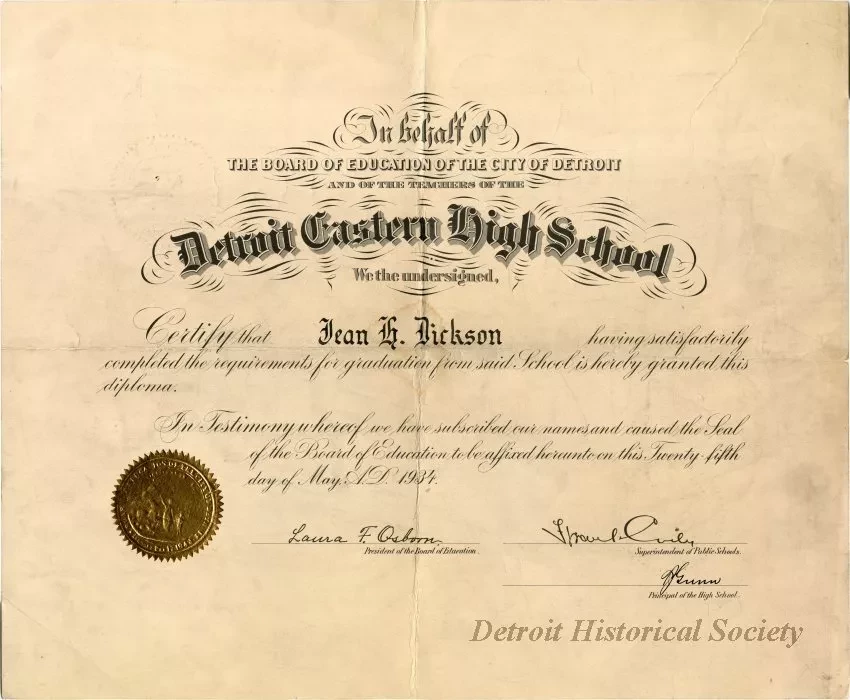 One diploma, dated May 25, 1934, that was issued to Jean H. Dickson on the occasion of her graduation from Eastern High School in Detroit. The diploma is printed in black script and Old English style text on heavyweight light tan paper. The signatures of the President of the Board of Education, Superintendent of Public Schools, and Principal of the High School are shown in black handwritten text at the bottom of the diploma. A gold-colored embossed seal of the Board of Education of the City of Detroit is affixed near the lower left corner.