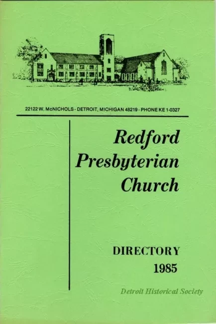 Click to enlarge 2009.090.025 Directory, Membership Membership directory for Redford Presbyterian Church. Date 1985 Collection Religion Extent of Description 6" x 9" 36 pages Search Terms Redford Avenue Presbyterian, Presbyterian, Churches Request Image