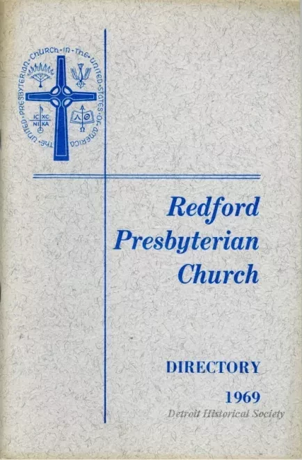 Click to enlarge 2009.090.013 Directory, Membership Membership directory for Redford Presbyterian Church. Date 1969 Collection Religion Extent of Description 6" x 9" 88 pages Search Terms Redford Avenue Presbyterian, Presbyterian, Churches Request Image