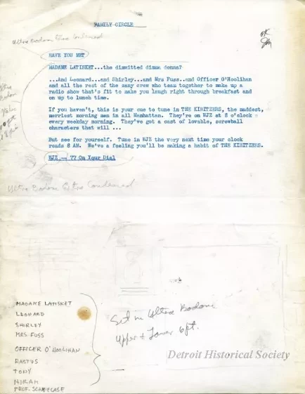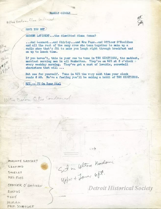 One sheet of paper with a rough draft of an advertisement for the radio show, "The Kibitzers," typewritten in blue ink. A variety of handwritten pencil notes are scrolled across the paper including notes on which font to be used as well as information to add. The advertisement asks listeners if they are familiar with the variety of characters that Toby David and Larry Marino create for the show which ran at 8 a.m. on WJZ Radio.