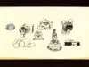 Sanders advertising art which consists of eight black ink drawings on vellum. The drawings include various cakes, ice cream, bread, Santa Claus, and a clock. The artwork is covered with an inner sheet of vellum and an outer sheet of brown paper that fold over from the top.