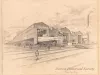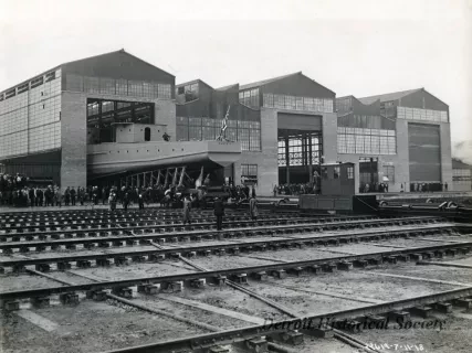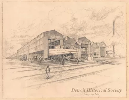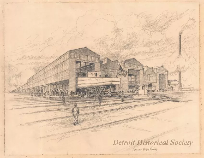 One pencil drawing on heavy art paper that shows the Eagle Boat construction work at Building B of the Ford River Rouge factory complex. The view shows an Eagle Boat being moved on railroad tracks out of the assembly building and to the launch area. Many workmen can be seen on the ground beside the boat. The drawing is signed by the artist, "Vernon Howe Bailey," in the lower right corner and is one of a group of eight drawings that he made of the Eagle Boat construction work.