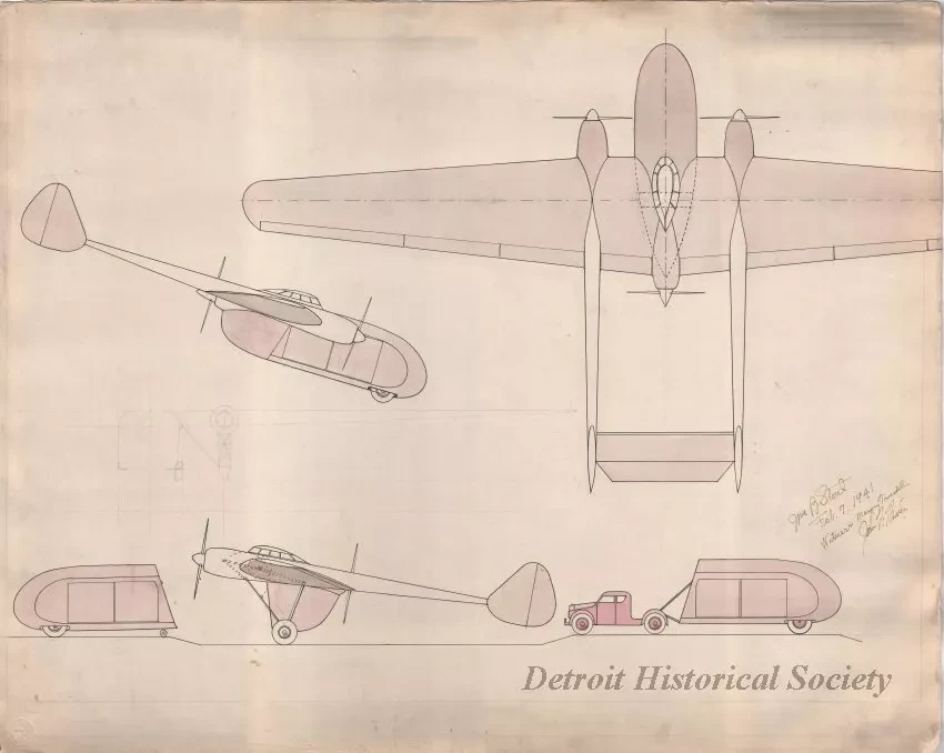 One conceptual drawing of a proposed trailerable airplane. The drawing consists of black ink on heavy white art paper that shows five plan and profile views of a 3-engine airplane that can be collapsed and stored inside a small, truck-drawn trailer. The images have been tinted with light red and gray watercolors. A faint, incomplete pencil sketch of a propeller, wheel, and wing is shown at the center left side of the sheet. On the lower right side, the drawing was signed by the designer, "Wm. B. Stout, Feb. 7, 1941," in black ink and was witnessed by "Margery Truesdell" and "John F. Fisher." The airplane shown in this drawing is similar to the "Stout Sky Car" that is shown for object number 1948.149.145.