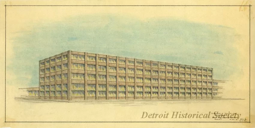 Architectural rendering of a Champion Spark Plug Co. facility created by Giffels & Vallet Inc, L. Rossetti Assoc. Engineers & Architects.