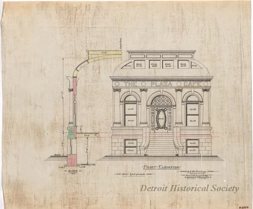 One architectural drawing entitled "The Plaza Cafe - Front Elevation." The drawing (Job 167) consists of black ink on linen and shows a wall cross-section and front elevation view for a proposed restaurant building that has a Beaux-Arts architectural style. This drawing, shown at a scale of 1/4 inch = 1 foot, was part of a set of seven sheets that were prepared by "S. C. Falkinburg, Architect." Some red, green, and yellow pencil shading has been added on the verso to highlight various architectural details.