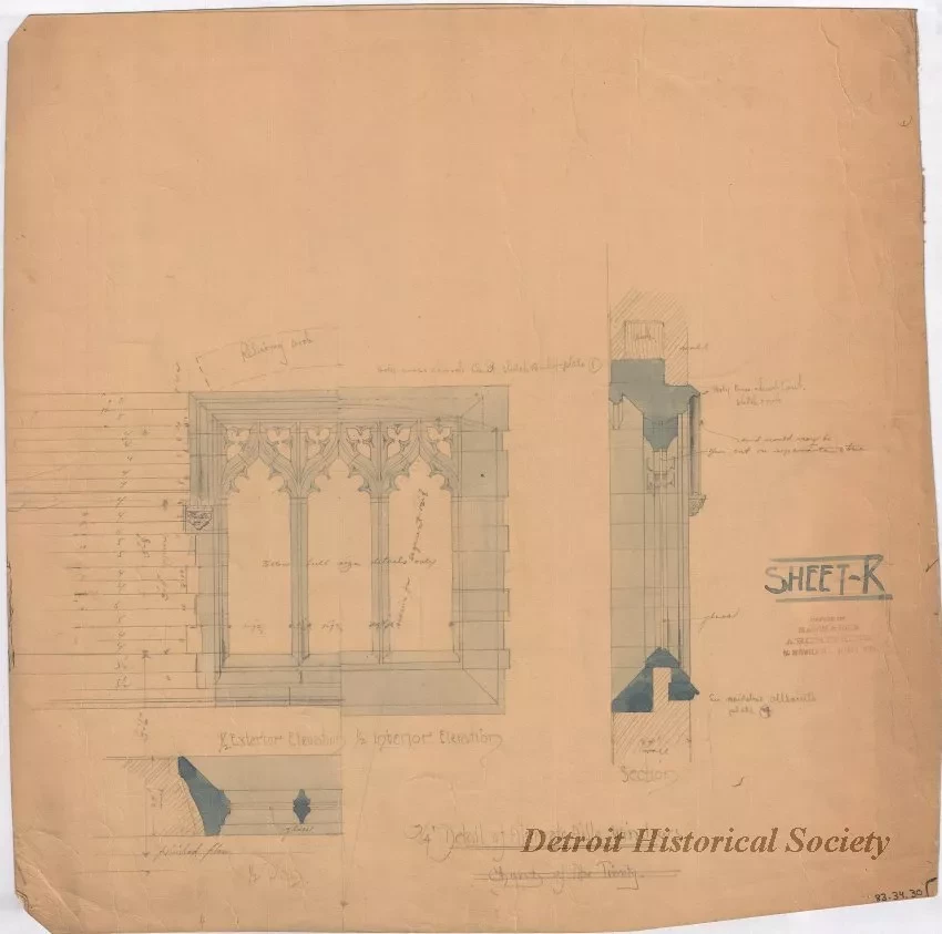 One drawing titled "Sheet K." The drawing consists of black pencil and blue ink on heavy tan paper and shows details for a decorative window with three stone archways in the English Gothic style church. A blue ink stamp beneath the title shows "Office of Mason & Rice Architects, 80 Griswold St., Detroit, Mich." The church is located at the corner of Trumbull Avenue and Myrtle Street.