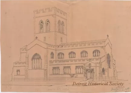 One drawing of Trinity Episcopal Church. The drawing consists of black ink on heavy tan paper and shows a view of the front and side of the English Gothic style church building. The church is located at the corner of Trumbull Avenue and Myrtle Street.