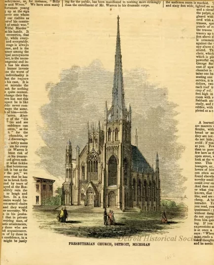 Color engraving of Fort Street Presbyterian Church in Detroit, located on the corner of Fort and Third Street. Image and surrounding text were clipped from an article detailing the construction and opening of the church from the December 15, 1855 issue of Ballou's Pictorial and mounted on cardboard. The article which the engraved drawing accompanies was originally located on page 380 in Ballou's Pictorial Volume IX, No. 24, Whole No. 232.