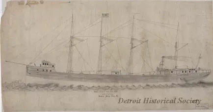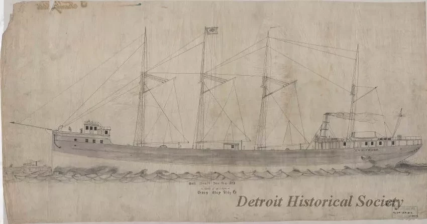 One drawing entitled "Sail Draft St'r. [Steamer] No. 39, Craig Ship Bldg. Co." The drawing is done in black ink on linen. It shows a port side exterior profile view of the proposed four-masted steamship, C. W. Elphicke. Gray pencil shading is shown on the hull and waves have been added to depict the vessel underway. Script text is printed on the verso in the upper left corner area and shows a shield emblem with the words, "Tracing Cloth." The drawing was prepared by the Craig Ship Building Company of Trenton, Michigan. It is shown at a scale of 1/8 inch = 1 foot and is undated. Handwritten text within a black ink stamp near the lower right corner shows "New Drawing No. Tol. 39-S9-0-2, Tube No. 1 of Str. 22."
