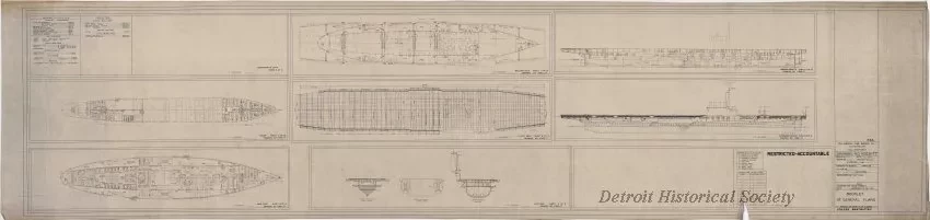 One plan sheet entitled, "Booklet of General Plans." The drawing consists of black ink on linen and appears to be the cover sheet for a set of plans. The sheet shows reduced-size images of the drawings that are depicted on sheets 2 through 9 of the plan set, including various plan, profile, and cross-section views of the proposed vessel. Tables of general information and capacities are shown in the upper left corner area of the sheet. The plans show an existing sidewheel steamship, the SS Seeandbee, being converted to an aircraft carrier, the U.S.S. Wolverine. A new flight deck was built on the old steamship hull. The name, "U.S.S. Wolverine," has been stamped in black ink at several locations on the sheet. The title block in the lower right corner shows that the drawing number, "H355-77," was prepared by the "American Ship Building Co." at a scale of 1/16 inch = 1 foot and is dated August, 1942.