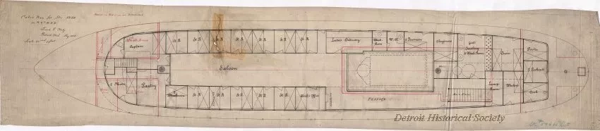 One plan sheet entitled, "Cabin Plan for Strs. 59/60 for Ft. & P.M. [Flint & Pere Marquette] R.R." The drawing consists of black and red ink on linen and shows a plan view of the proposed cabin layout for the wooden-hulled, propeller-driven, passenger steamships. The plan was prepared at a scale of 1/4 inch = 1 foot by Frank E. Kirby for the Detroit Dry Dock Company and is dated May, 1882. (Steamer numbers 59 and 60 were the Detroit Dry Dock hull numbers for the passenger steamships that were known as F.&P.M. No. 1 and F.&P.M. No. 2, respectively.)