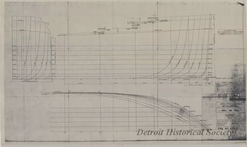 One plan sheet entitled "Hull No. 424, Lines Aft." This drawing is a blackline reproduction that shows the drawing and text in black on a mylar plan sheet. It shows a view of the hull lines in the aft section of the proposed steamship, SS Richard M. Marshall, which was built for the Great Lakes Steamship Company. A table of principal vessel dimensions is shown at the right side of the sheet. The title block in the lower right corner shows that the plan was prepared by the "Defoe Shipbuilding Co., Bay City, Michigan," at a scale of 1/4 inch = 1 foot and is dated November 12, 1951. The plan was approved by the owner on August 20, 1952. The drawing number is shown as "424-11-2." This vessel later became part of the Ford Motor Company fleet as the SS John Dykstra and also the SS Benson Ford.