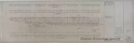 One plan sheet entitled, "Main Deck Side Plating - Aft End." The drawing consists of black ink on linen and shows a port side exterior profile view of the aft section of the sidewheel steamship, SS Seeandbee, which was converted to an aircraft carrier, the U.S.S. Wolverine. The plan shows various structural modifications that were made to the old steamship hull to allow for the addition of a new flight deck. The title block in the lower right corner shows that the drawing number, "H355-4" was prepared by the "American Ship Building Co." at a scale of 1/4 inch = 1 foot and is dated May 6, 1942.
