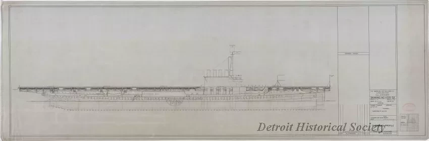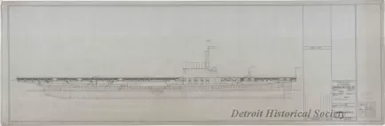One plan sheet entitled, "Outboard Profile." The drawing consists of black ink on linen and shows a starboard side exterior profile view of the sidewheel steamship, SS Seeandbee, which is being converted to an aircraft carrier, the U.S.S. Wolverine. A new flight deck was built on the old steamship hull. The title block in the lower right corner shows that the drawing number, "H355-52 65," was prepared by the "American Ship Building Co." at a scale of 1/8 inch = 1 foot and is dated July 4, 1942.