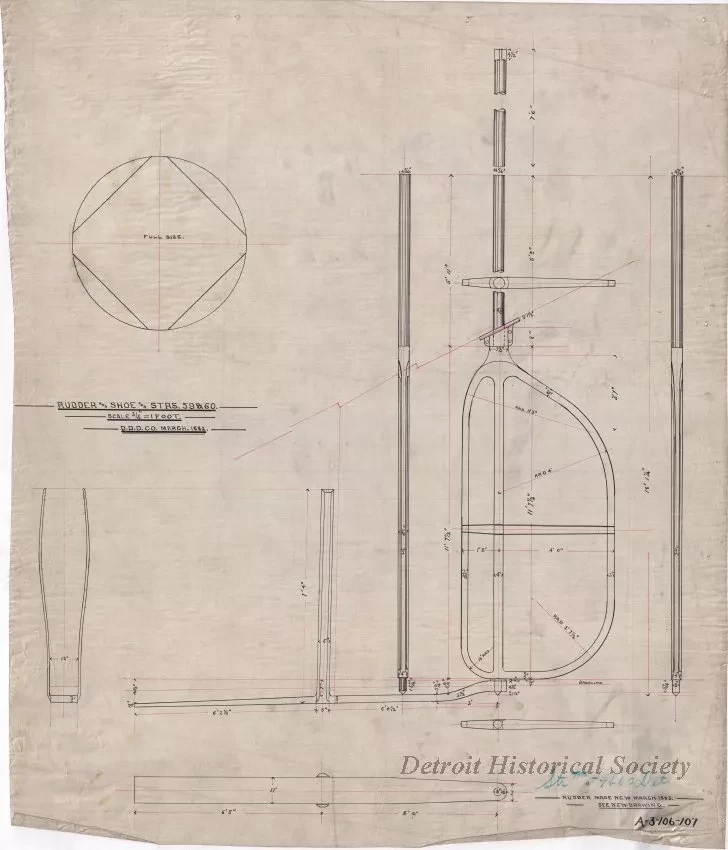 One plan sheet entitled, "Rudder and Shoes for Strs. 59 & 60." The drawing consists of black ink on linen and shows details of the rudder assembly for the proposed wooden-hulled, propeller-driven, passenger steamships. The plan (number A-3-106-107) was prepared at a scale of 3/4 inch = 1 foot by the Detroit Dry Dock Company and is dated March, 1882. (Steamer numbers 59 and 60 were the Detroit Dry Dock hull numbers for the passenger steamships that were known as F.&P.M. No. 1 and F.&P.M. No. 2, respectively.)