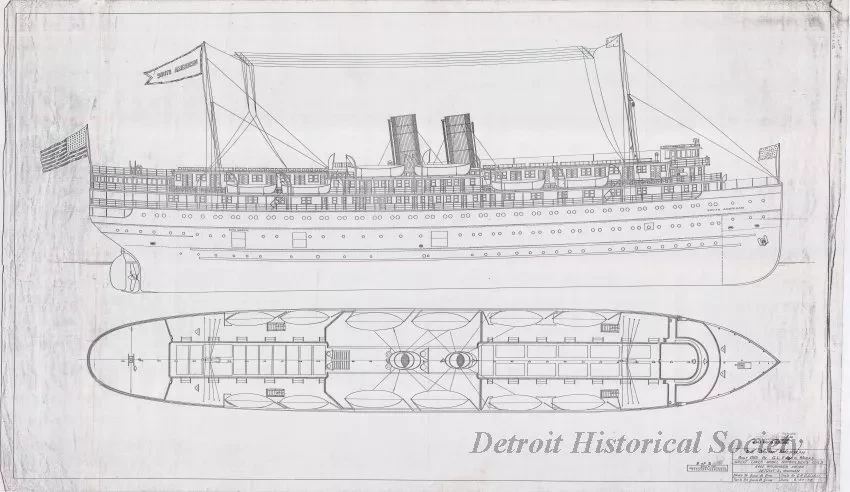 One blackline mylar reproduction of a drawing (sheet 3 of 3) entitled "S.S. South American, Built in 1915 by G. L. [Great Lakes] Engineering Works." The drawing shows a starboard side exterior profile view and upper deck plan view of the passenger steamship. The drawing was done by James B. Jones at a scale of 1/8 inch = 1 foot for the Great Lakes Model Shipbuilders Guild.