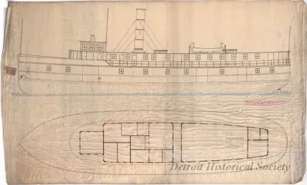 One drawing entitled "Steam Railroad Ferry for Mackinaw and Point St. Ignace." The drawing consists of black, blue, and red ink on linen and shows profile and plan views of the proposed railroad ferry that was later named, SS Algomah (Algoma). The plan was drawn at a scale of 1/4 inch = 1 foot by the Detroit Dry Dock Company and is dated July 20, 1881.