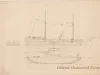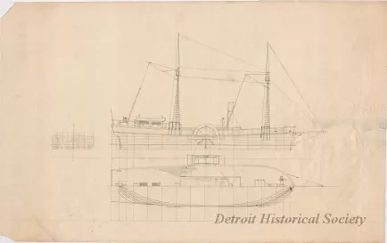 One drawing of the sidewheel steamship, WALK-IN-THE-WATER. The ink drawing on light tan paper shows a starboard side profile view of the ship as well as a plan view of the main deck. No title block information is shown. Possibly, this drawing was done by either Ronald Konzak or Emmett Priestley who both built models of the Walk-in-the-Water for the Dossin Great Lakes Museum. Also, it is possible that the drawing was done by a member of the Great Lakes Model Shipbuilders Guild.