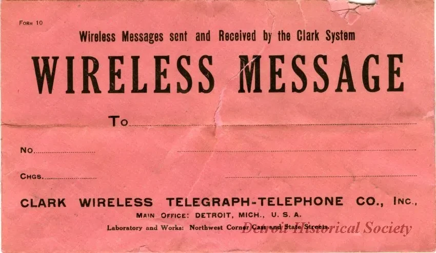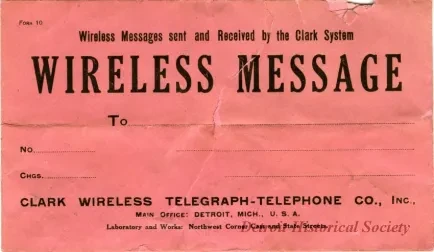 Salmon-colored envelope for wireless messages sent and received by Thomas E. Clark's wireless telegraph system. The envelope has a form on the front with spaces for the addressee, the telegram number, and for charges. "Clark Wireless Telegraph-Telephone Co., Inc., Main Office: Detroit, Mich, U.S.A., Laboratory and Works: Northwest Corner Cass and State Streets." is printed along the bottom of the envelope.