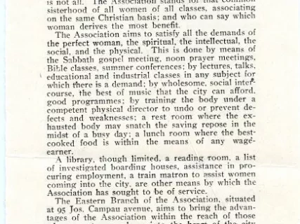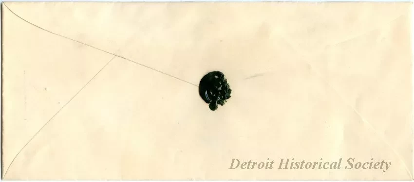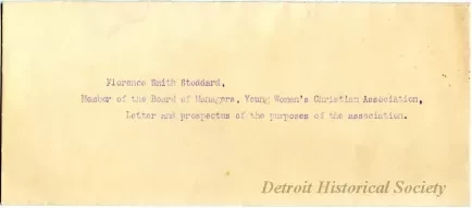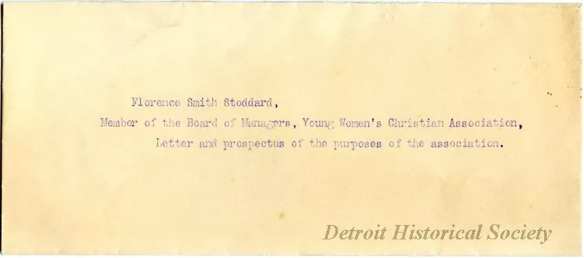 This slightly yellowed paper envelope contained a 3-page letter written by Florence Smith Stoddard, a member of the Board of Managers of the Young Women's Christian Association. The front of the envelope has typewritten text that shows "Florence Smith Stoddard, Member of the Board of Managers, Young Women's Christian Association, Letter and prospectus of the purposes of the association." The back flap of the envelope is sealed with an irregularly-shaped blot of dark green wax.