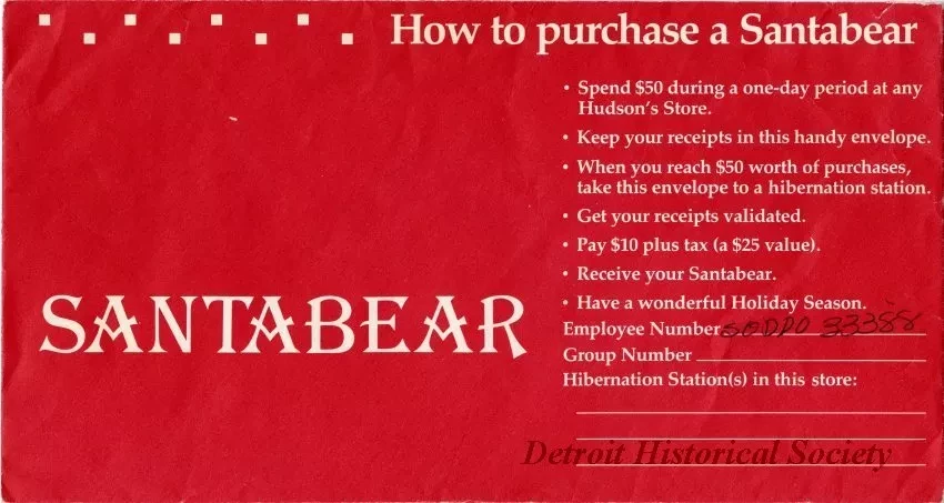 Envelope for saving receipts from Hudson's to be redeemed for a Santabear. The envelope is red with the instructions for obtaining a Santabear from the store's Hibernation Station printed in white. A blank for "Employee Number," has been filled in with "SODDO 33388." A note is handwritten in red pen on the inside of the envelope's flap, "2-19-86, Terri & I squared away last yrs $ and this years money."