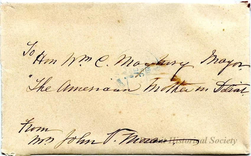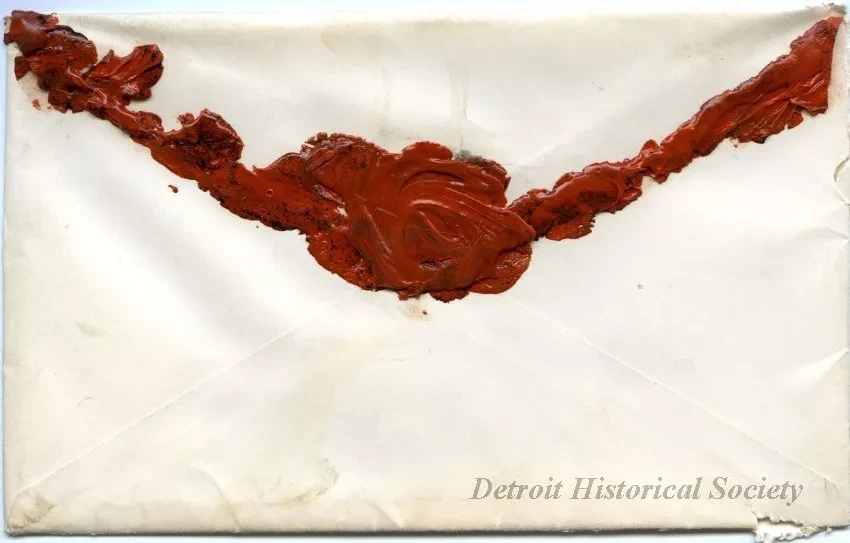 This slightly yellowed paper envelope contained a 12-page letter that was written by Mrs. John Vallée Moran (née Emma Etheridge). The front of the envelope is addressed "To Hon. Wm. C. Maybury, Mayor" and is entitled, "The American Mother in Detroit, from Mrs John V. Moran." The back flap of the envelope is sealed along its entire edge with an irregularly-shaped line of red wax.