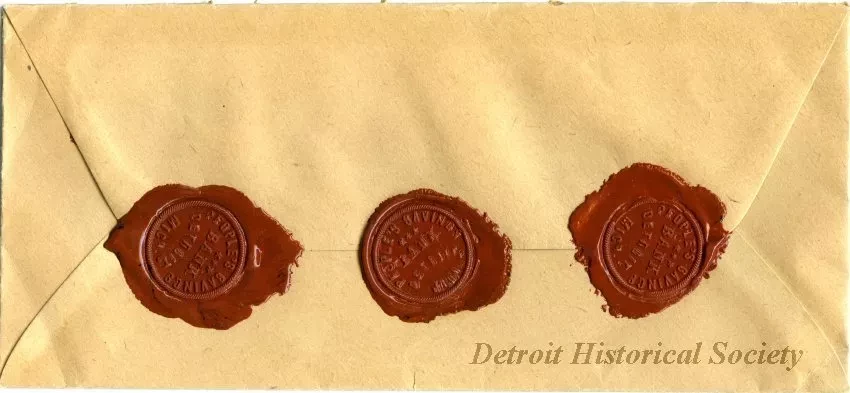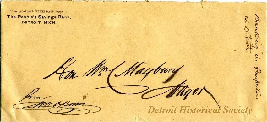 This tan paper envelope contained a 6-page letter that was written Michael W. O'Brien who was the President of the People's Savings Bank. The front of the envelope is addressed in handwritten text to "Hon. Wm. C. Maybury, Mayor, from M. W. O'Brien" and shows the subject of the letter, "Banking in Prospective in Detroit," in handwriting along the right edge of the envelope. The return address of the bank is printed in black text in the upper left corner of the envelope. The back flap is secured with three red wax seals that have been impressed with the seal of the bank.