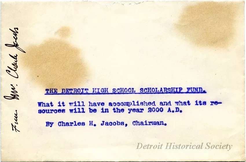 This stained and slightly yellowed paper envelope contained a 1-page letter that was written by Charles H. Jacobs who was the Chairman of the fund and also the Vice President and Managing Director of the Buhl Stamping Company. A handwritten note along the left edge shows "From Mr. Charles Jacobs." The center area of the envelope shows the typewritten title, "The Detroit High School Scholarship Fund. What it will have accomplished and what its resources will be in the year 2000 A.D., By Charles H. Jacobs, Chairman."