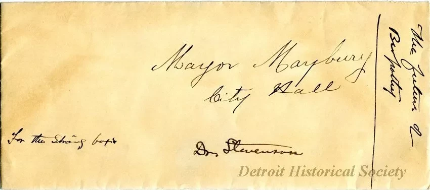 This slightly yellowed paper envelope contained a 2-page letter that was written by Dr. Samuel S. Stephenson, M.D. The front of the envelope is addressed in handwriting to "Mayor Maybury, City Hall" and is entitled, "The Future of Biopathy," along the right edge. The letter also has the note, "For the strong box," and signature, "Dr. Stevenson" [Stephenson].