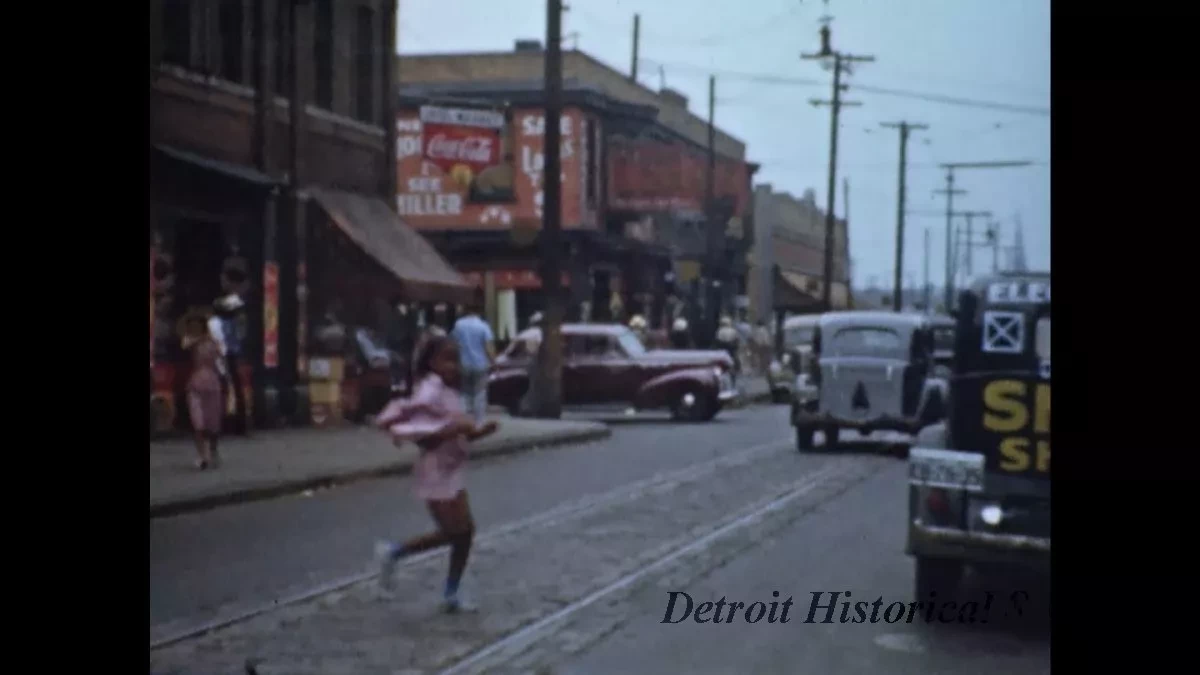 The camera then moves to a spot along Hastings Street in Black Bottom, likely to a point on the east side of Hastings between Division Street and Alfred Street. The camera pans from the opposite side of the street where a sign over a storefront promotes the political campaign of Louis R. Taylor (of the United Tenants Association, which maintained an office at 2731 Hastings), around to peer further down the street. A car painted with "Elect Joseph A. Smith, Sheriff, Democrat" is parked in front of the camera operator. A sign for a bar and a partially visible sign that reads "Public" are posted along this side of the street. Streetcar rails run along the center of the street.