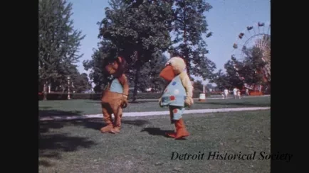The video opens with several shots of the island's flowers, with attractions such as the Round-Up and the C.P. Huntington train in the background. This is followed by several shots of people in the park's picnic area. In several such shots, the mascots Louie the lion and a pelican in a green polka-dotted outfit, visit the picnickers. Next are several shots taken outside of the Bob-Lo Pavilion Theatre, including the building's sign, and people walking along the walkways around it. Several shots follow of golfers and obstacles at the park's miniature golf course.