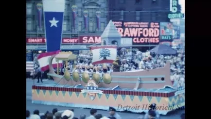 For the first shot of one of the history-theme parade floats, the camera stationary on west side of Campus Martius, above the lawn of City Hall with the Bagley Fountain and the signs for Sam's Cut-Rate in Opera House in the background. The first float, sponsored by General Motors, represents the United States taking possession of the city on July 11, 1796. Colonial soldiers, cannons, and the Liberty Bell are on the float, while more soldiers march behind the float.