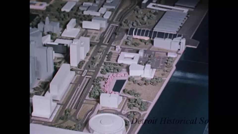 The half of the film concerning the development of the Civic Center includes shots of construction for the center and for underground parking in Grand Circus Park, a map of the project, and concept art showing a park in the center of Cadillac Square and plans for Civic Center Park. The section also contains spotlights on the completed elements of the plan--the Veterans Memorial Building, City-County Building, and Henry and Edsel Ford Auditorium. There is a portion connecting the need for underground parking in the Civic Center with the new expressways leading to downtown. There are also shots of architectural models of the Convention Hall-Exhibits Building, which would become Cobo Hall and Arena. One model shows the hall in detail, and another shows it in the context of the rest of the Civic Center development plans as well as pre-existing parts of downtown. In addition to shots of downtown and the construction in the Civic Center, one of the Boblo Boats and one of the Chicago, Duluth, and Georgian Bay Transit Company boats are shown docked on the riverfront in one shot.