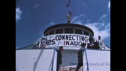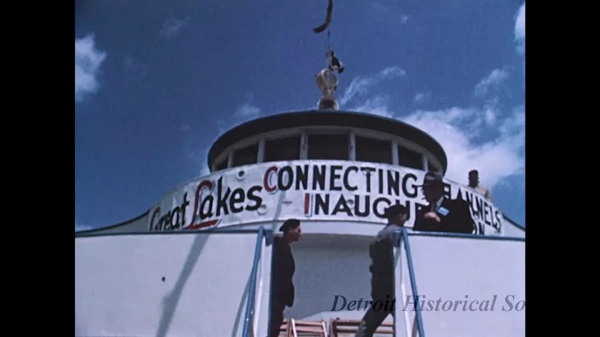 The film then recounts the events of the Great Lakes Connecting Channels Inauguration on May 28, 1957. The Detroit Police Band is shown playing at downtown Boblo dock, and people are filmed boarding the Boblo boat STE. CLAIRE. On board, the camera films the boat's whistle blowing, and captures shots of the city's skyline, the Ambassador Bridge, the Detroit Fire Department fire tug JOHN KENDALL spraying its hoses in a display, a Hutchinson and Company freighter, and the Pringle Barge Line Company, Incorporated tugboat S.M. DEAN with its self-unloading barge CONSTITUTION. The camera also gets brief shots of the Amherstburg dock, and Boblo Island dock. At Boblo the passengers disembark, and the Royal Mounted Police lead the Detroit Police Band in a parade. A parade of small craft on the river is also shown. The ceremony then begins. In addition to several shots of the crowd, the film also spotlights the speakers: Monsignor Edward J. Hickey, Chairman Walker L. Cisler, Robert Biggers of the Executive Committee. Canadian Minister of Health and Welfare Paul J.J. Martin, U.S. Army Chief of Engineers Major General Emerson C. Itschner, Dutch ambassador to the U.S. J.H. van Roijen, Rev. M.C. Davies of Canada, and Secretary of the Army Wilber M. Brucker. The ceremony ends with the first dynamite blast of the project.