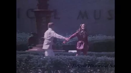 In the portion of the film dealing with other attractions, Boblo Island is represented by a shot of the Boblo boat COLUMBIA, several scenes of Greenfield Village are included, the Detroit Symphony Orchestra is shown performing at the Michigan State Fair band shell, and a ballet performance at Meadowbrook is featured. There is also mention of tours of the Vernor's and Stroh's factories, as well as of an unidentified television studio. The region's museums are listed over shots of the Detroit Institute of Arts, the Detroit Historical Museum, and the money museum in the lobby of the National Bank of Detroit Building.
