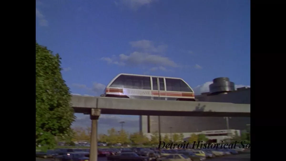 The camera then moves to the parking lot of Fairlane Town Center for a series of shots of the Ford ACT monorail which linked the mall of a station in the Hyatt Regency hotel. The monorail is shown passing overhead, and entering the hotel's station.