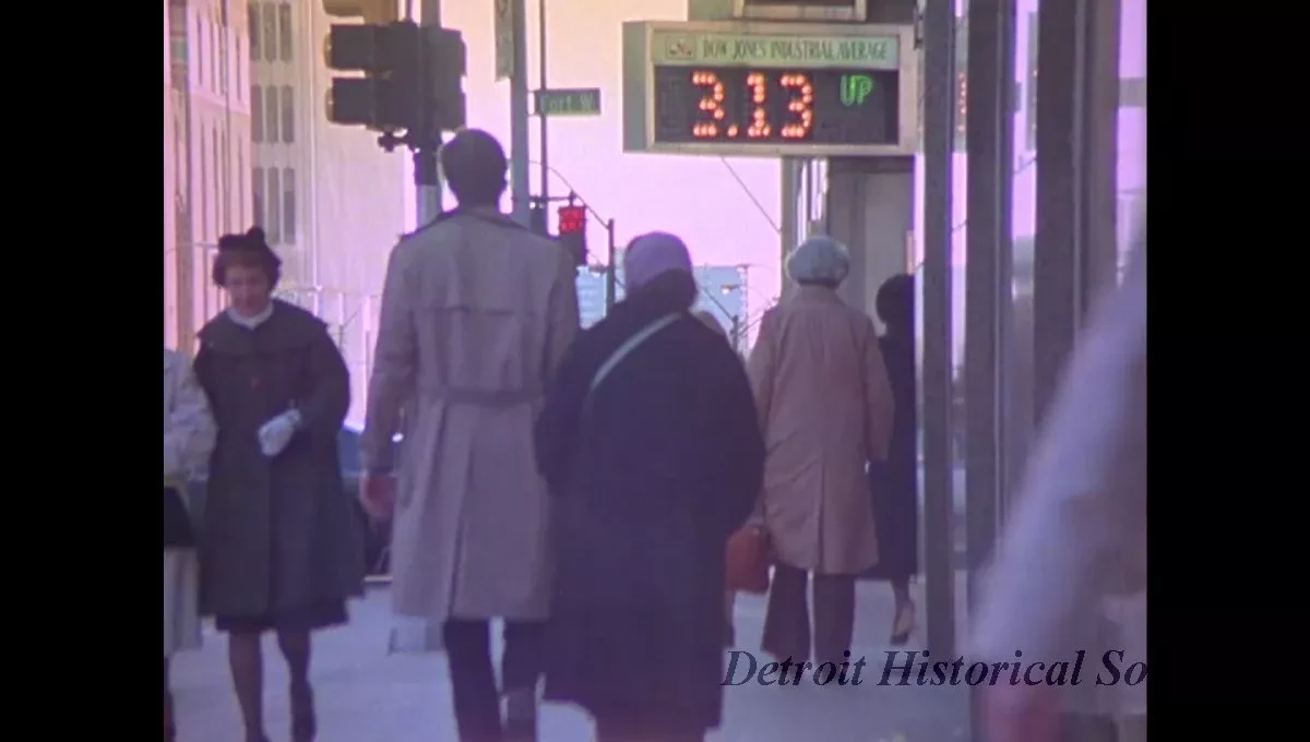 The next section of the film consists of exterior shots around downtown, with an emphasis on signs and buildings connected to financial institutions. The sequence begins with a pan from the entrance of the Manufactures National Bank on the north corner of Michigan Avenue and Griswold Street, up to the neighboring 1001 Woodward building. Then, in a shot south along the west side of Griswold Street, just north of Fort Street, people walking along the sidewalk below the City National Bank Dow Jones average sign on the side of the Dime Building. Next the camera gets a close-up of the Commonwealth plaque at the Dime Building. Afterward, people are shown walking along the west side of Griswold in front of the Ford Building, as taken facing south. A brief shot follows of people walking outside one of the entrances to the First National Building. Then, the National Bank of Detroit sign above the northwest entrance to the National Bank of Detroit Building is shown, with the windows of First National Building visible in the background. A shot of people exiting the National Bank of Detroit Building follows. Then the camera pans down the Fort Street face of the Detroit Bank and Trust Building at 211 West Ford Street.
