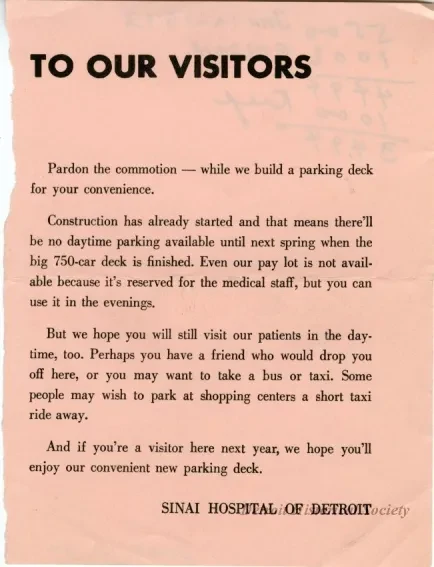 Notice printed on pink paper to visitors of Sinai Hospital apologizing for the commotion resulting from their construction of a 750-car parking deck, and the present lack of daytime parking. They offer being dropped off, taking a bus or taxi, parking at a nearby shopping center, or waiting for the pay lot to become accessible in the evenings as alternatives. "Jan 10-1973," along with some subtraction of figures labeled as "Edison," and "Keep," resulting in a difference of 34.94 are handwritten in ink on the verso.