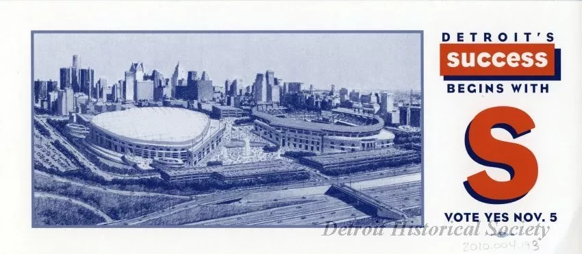 Political flyer from the Committee to Rebuild Detroit and Wayne County urging voters to vote "yes" on Proposal S on the 1996 ballot to build new stadiums for the Detroit Tigers and the Detroit Lions in Detroit. The recto contains a drawing of the proposed stadiums, and the verso lists the benefits of the plans, including Mayor Dennis Archer's endorsement.