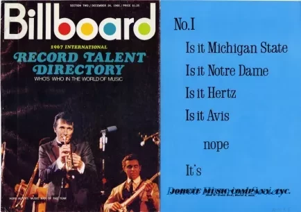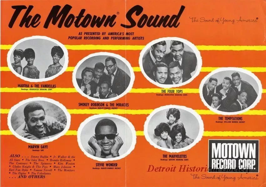 Single sheet, half-folded promotion flyer showing a selection of Motown Record Corporation Artists against a orange background on the recto, and the verso is split between the cover of the December 24, 1966 ,1967 International Record Talent Directory issue of Billboard featuring Herb Alpert and an advertisement for Jobete Music Company, Incorporated of 2648 West Grand Boulevard. Martha and the Vandellas, Smokey Robinson and the Miracles, the Four Tops, the Temptations, the Marvelettes, Stevie Wonder, and Marvin Gaye are all pictured on the recto, along with the slogan, "The Sound of Young America."