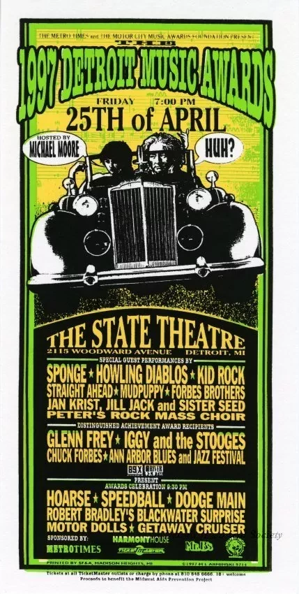 Screen printed flyer for the 1997 Detroit Music Awards, designed by Mark Arminski. The flyer is printed in green, yellow, and black on white paper and includes an image of Ludwig van Beethoven driving a car, with a woman in the passenger seat. Through word balloons, the woman is saying, "Hosted by Michael Moore," to which Beethoven replies, "Huh?" The award show was scheduled for April 25, 1997 at the State Theatre. The flyer lists performances by Sponge, the Howling Diablos, Kid Rock, Straight Ahead, Mudpuppy, the Forbes Brothers, Jan Krist, Jill Jack, Sister Seed, and Peter's Rock Mass Choir. Glenn Frey, Iggy and the Stooges, Chuck Forbes, and the Ann Arbor Blues and Jazz Festival are also listed as "distinguished achievement award recipients." Hoarse, Speedball, Dodge Main, Robert Bradley's Blackwater Surprise, the Motor Dolls, and Getaway Cruiser are listed as playing an awards celebration after party. The flyer also lists the event's sponsors--Harmony House, the Metro Times, Ticketmaster, Mr. B's, Memphis Smoke, 89X, and 93.9 The River.