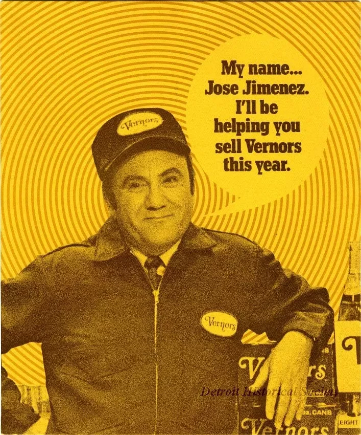 One heavy paper folder for holding Vernor's advertising and marketing materials. The folder has a mustard color with a grainy, sepia colored image of comedian, Bill Dana, who is portraying his fictional comic character, Jose Jiminez. He is dressed as a Vernor's deliveryman and printed text above the image shows "My name ... Jose Jiminez. I'll be helping you sell Vernors this year." The folder interior has two pockets. A handwritten note near one of the pockets shows "Photo: Bob Kunz Photography."