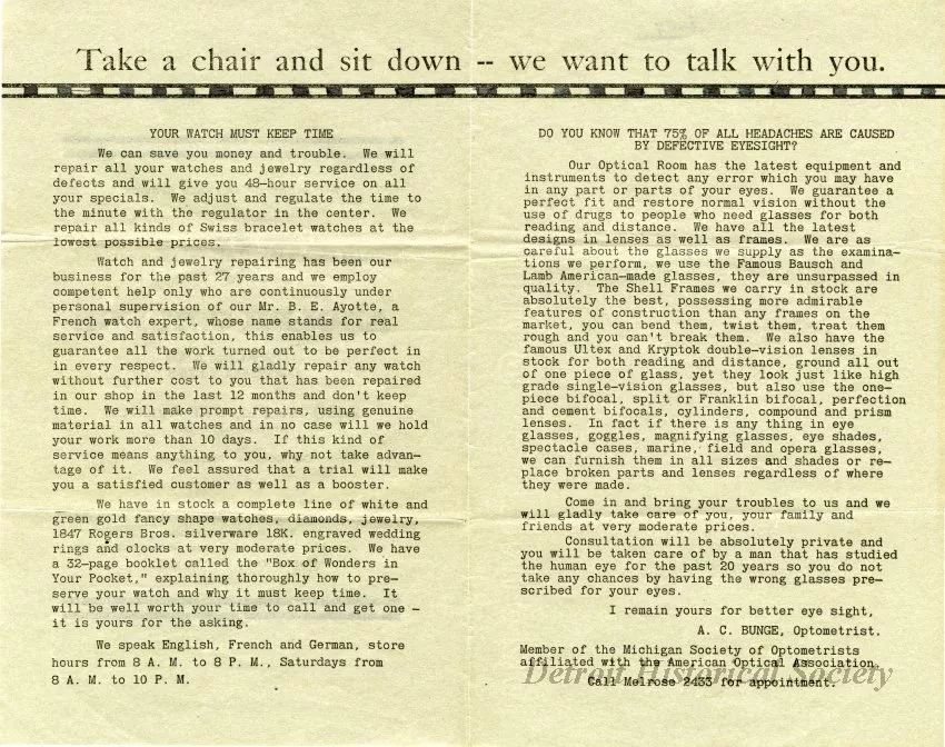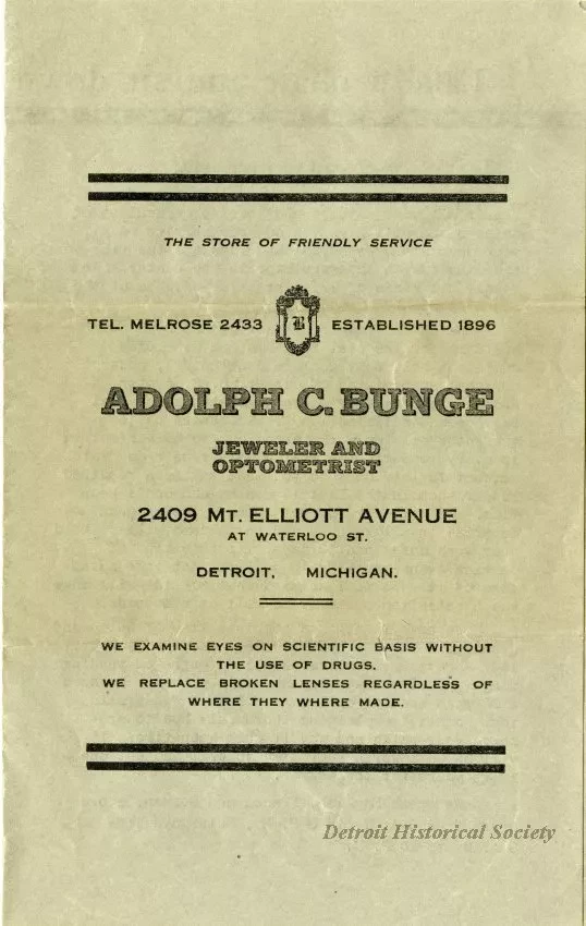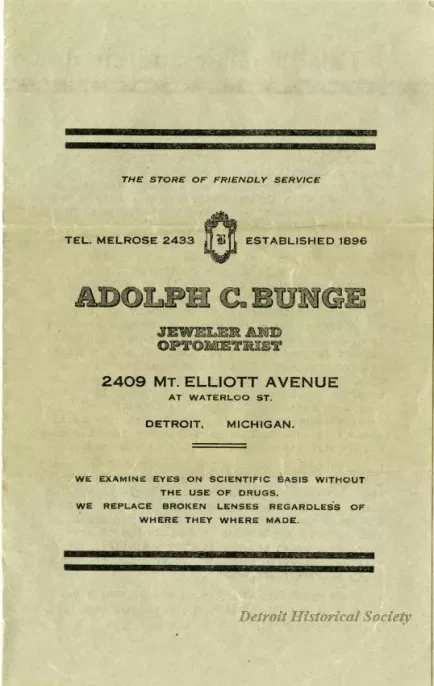 Half folded handbill advertising Adolph C. Bunge, Jeweler and Optometrist, located at 2409 Mt. Elliot Avenue. The first page of the interior details Bunge's watch repair service, and includes the note, "We speak English, French and German, store hours from 8 A.M. to 8 P.M., Saturdays from 8 A.M. to 10 P.M." The second page concerns the optometry side of his business. The handbill is printed on grey-green paper.